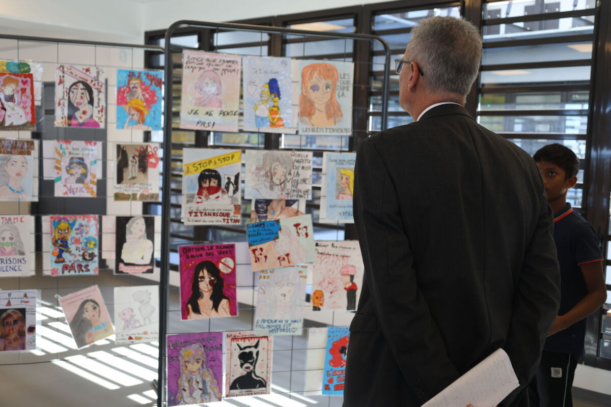 Accueilli par la principale Nathalie Pulou, il a découvert les initiatives de l’établissement en matière de sensibilisation aux violences sexistes et sexuelles. Une visite guidée par des élèves de 5e lui a permis de parcourir une exposition dédiée à ce thème.