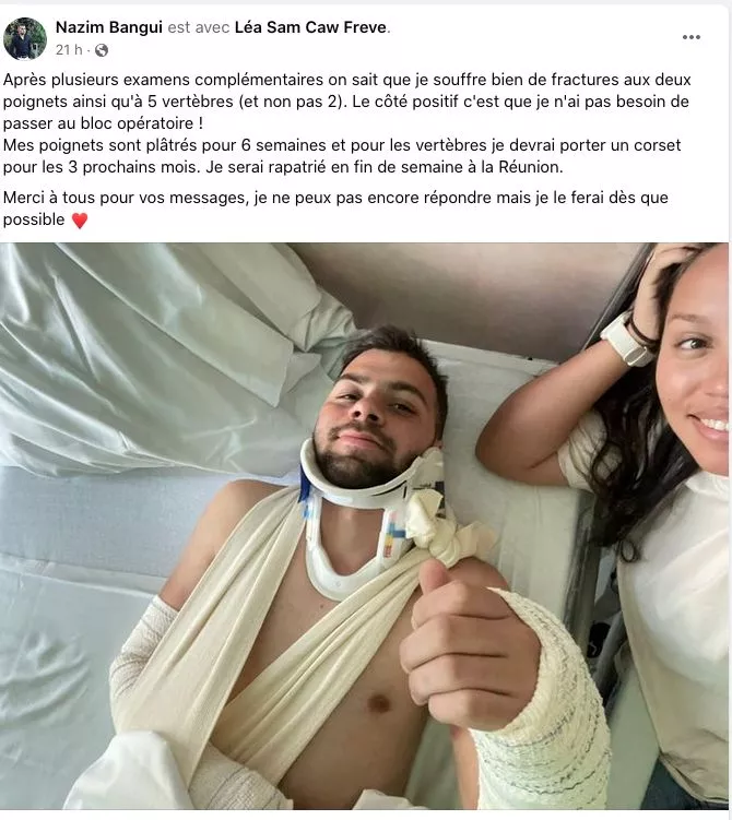 Le réunionnais, Nazim Bangui qui participait à la 37e édition du rallye Vosges Grand Est a été victime d’une sortie de route. Le jeune homme souffre de fractures aux deux poignets et à cinq vertèbres.