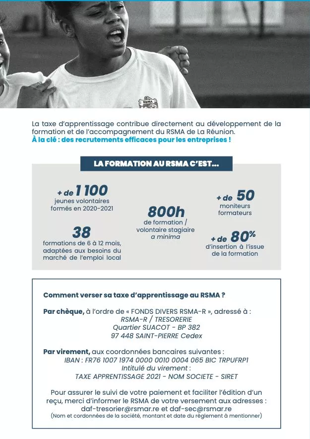 Choisir le RSMA, c’est donner du sens à votre taxe d’apprentis- sage en participant à l’insertion sociale et professionnelle de la jeunesse réunionnaise !