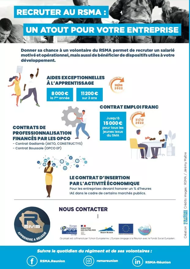 Jusqu’au 31 décembre 2022, les volontaires issus du RSMA sont éligibles au dispositif des emplois francs, soit jusqu’à 15 000 euros d’aide à l’embauche pour un CDI temps plein. Il s’agit également d’une aide significative pour les entreprises locales dans ce contexte particulier.