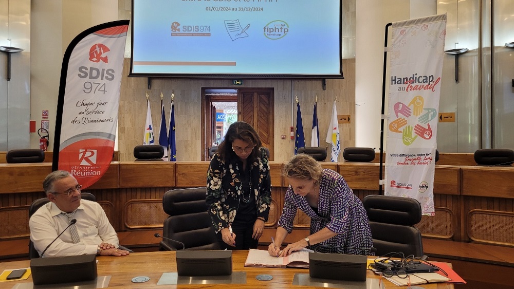 Le Service Départemental d’Incendie et de Secours de La Réunion (SDIS 974) est fier d’annoncer la signature d’une convention stratégique avec le Fonds pour l’Insertion des Personnes Handicapées dans la Fonction Publique (FIPHFP). Cette signature, effectuée par Mme Sophie ARZAL, présidente du conseil d’administration du SDIS 974, en présence de M. Gilles HUBERT, membre du CASDIS et président du comité de pilotage de la politique handicap au sein de l’établissement, et Mme Laure BEN MOUSSI, directrice territoriale du FIPHFP, marque le début d’une collaboration novatrice.
