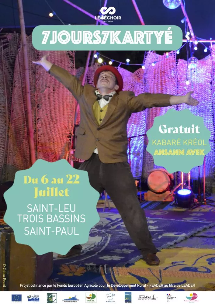 Pour la 2ème année, pendant les vacances scolaires et dans le cadre de 7jours7kartyé, Le Séchoir s’installe dans les territoires des hauts de la côte ouest pour un kabaré kréol itinérant. Des ateliers de magie et d’acrobatie la journée à partir de 8 ans avec une restitution pendant le spectacle Ansanm avek . Ce projet se déroule pendant 2 semaines du 6 au 22 juillet 2022 avec une halte dans 7 kartyé :