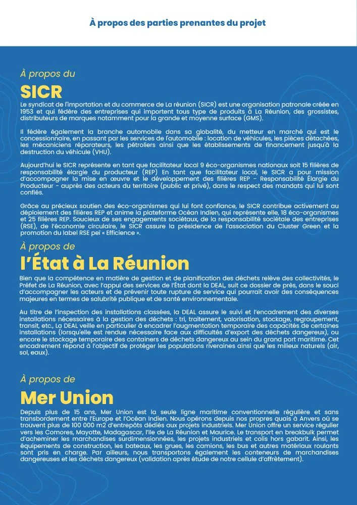 Dossier de presse Le SICR pilote l’affrètement de déchets dangereux et non dangereux vers Le Havre grâce à un bateau financé à 100% sur fonds privés 22.11.2023-17 par Céline Hardelain 23 novembre 2023 1 min de lecture Ne manquez pas toute l’actualité de La Réunion ! Abonnez-vous à la newsletter de Free Dom ! Valider Partager Facebook Twitter Pinterest Linkedin Whatsapp Reddit Email Céline Hardelain Laisser un commentaire Annuler la réponseYour email address will not be published. Enregistrer mon nom, mon e-mail et mon site dans le navigateur pour mon prochain commentaire. Current ye@r * Leave this field empty Articles récents... Jeudi 1ᵉʳ janvier 2026 – Météo, éphéméride et horoscope du jour Mercredi 31 décembre 2025 – Météo, éphéméride et horoscope du jour Hommage à Johnny Hallyday sur Free Dom 2 ce 5 décembre Mardi 30 décembre 2025 – Météo, éphéméride et horoscope du jour Saint-Joseph : découverte de 2337 plants de cannabis, arrestation de 2 individus Point sur le réseau routier départemental, 29 décembre à 16H30 Suicide sur le pont de la Rivière d’Abord : importante mobilisation des secours et des forces de l’ordre Radier submergé à Ilet Furcy : la route de Cilaos fermée à la circulation cette nuit Fortes pluies : appel à la plus grande prudence à Saint-Paul