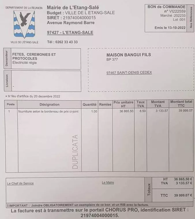 Concernant la mairie de l’Etang Salé vous nous donnez effectivement le bon de commande donnant le prix du feu d’artifice, mais pouvez vous en faire de même (c’est à dire mettre en ligne dans votre article) avec la facture concernant les artistes qui vont se produire sur scène pour le même événement s’il vous plaît afin qu’on est le prix global de cette événement du 20 décembre 2022 pour pouvoir nous faire vraiment une petite idée de la dépense concernant cela. Puis pour les frais de représentation du maire vous dites que de mars à novembre 2022 le maire a utilisé 2560.70€ pouvez vous nous apporter les preuves s’il vous plaît étant donné que vous avez des preuves. Nous vous remercions.