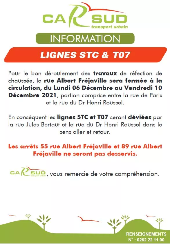 CASUD/Collectivités Le Tampon : des perturbations sur les lignes STC et T07 sont à prévoir par La Rédaction 6 décembre 2021 1 min de lecture En raison de travaux de réfection de chaussée, la rue Albert Fréjaville au Tampon sera fermée à la circulation, du lundi 06 décembre au vendredi 10 décembre 2021. Par conséquent, des perturbations sur les lignes STC et T07 sont à prévoir. Ne manquez pas toute l’actualité de La Réunion ! Abonnez-vous à la newsletter de Free Dom ! Valider Partager Facebook Twitter Pinterest Linkedin Whatsapp Reddit Email Vous pourriez être intéressé par 18 décembre 2025 Fit Dance dan Kartié : un premier semestre 2026 placé sous le signe du mouvement à Saint-Denis 14 novembre 2025 Pose de la première pierre de la nouvelle voie urbaine et de la Voie Verte du Tampon 30 octobre 2025 Attention : pas de collecte le 31 octobre et 1er novembre La Rédaction Laisser un commentaire Annuler la réponseYour email address will not be published. Enregistrer mon nom, mon e-mail et mon site dans le navigateur pour mon prochain commentaire. Current ye@r * Leave this field empty Article précédent St-André : un hommage aux « morts pour la France » pendant la guerre d’Algérie Article suivant St-Paul : plusieurs piscines municipales ferment pour entretien Articles récents... Hommage à Johnny Hallyday sur Free Dom 2 ce 5 décembre Mardi 30 décembre 2025 – Météo, éphéméride et horoscope du jour Saint-Joseph : découverte de 2337 plants de cannabis, arrestation de 2 individus Point sur le réseau routier départemental, 29 décembre à 16H30 Suicide sur le pont de la Rivière d’Abord : importante mobilisation des secours et des forces de l’ordre Radier submergé à Ilet Furcy : la route de Cilaos fermée à la circulation cette nuit Fortes pluies : appel à la plus grande prudence à Saint-Paul Saint-Gilles-les-Bains : une route impraticable, les riverains montent au créneau (VIDEOS) Très grands excès de vitesse : un délit passible de prison depuis le 29 décembre 2025 Fermeture temporaire du sentier de la Canalisation des Orangers (cirque de Mafate)