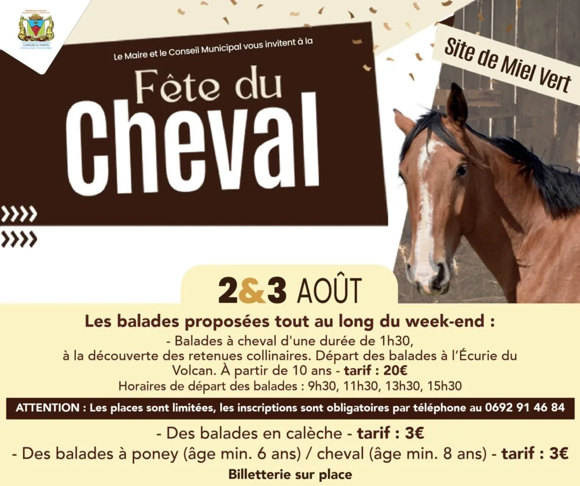 Parmi les temps forts : balades à cheval*, à poney ou en calèche, concours de maniabilité de calèches, démonstrations de lancer de lasso, ateliers de ferrage et animations podium assurées par les associations du Tampon. Une vente de produits du terroir viendra compléter cette ambiance authentique.
