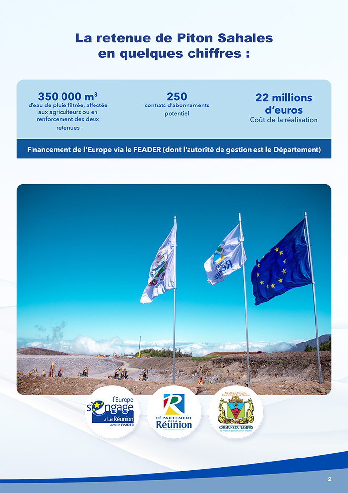 Situé sur une zone agricole en rive gauche du Bras de Pontho et à l’est de Bourg Murat, l’ouvrage de stockage Piton Sahales est destiné à assurer le stockage d’un volume de 350 000 m3 d’eau de pluie filtrée, affectée aux agriculteurs.