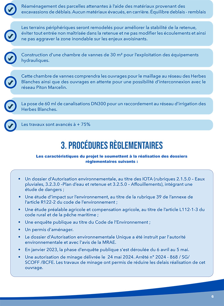 Ces ouvrages ont pour ambition de réduire le déséquilibre entre ressources et besoins en eau estimé à 2 millions m3 de stockage d’eau à l’horizon 2026.