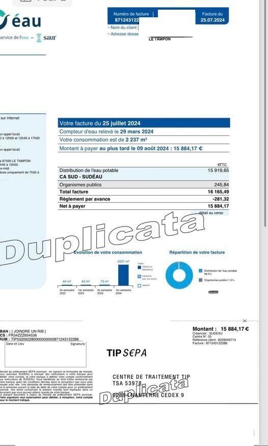 15 884 euros ! C’est le montant d’une facture d’eau qu’un abonné de la ville du Tampon devrait payer au plus tard le 9 août prochain.