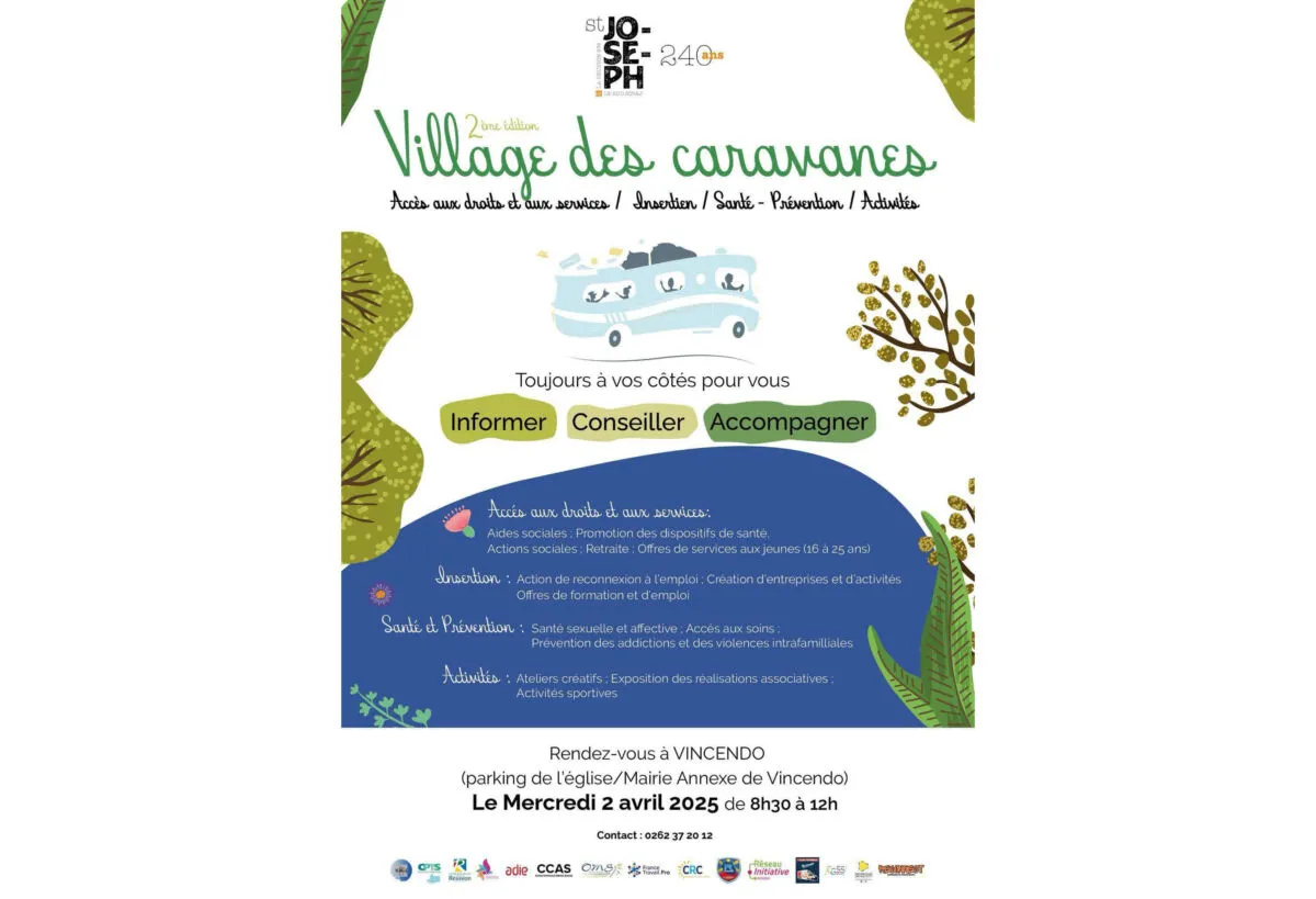 Le mercredi 2 avril 2025, Saint-Joseph accueille la deuxième édition du Village des Caravanes, de 8h30 à 12h, sur le parking de l’église et de la mairie annexe de Vincendo. Cet événement itinérant a pour ambition de faciliter l’accès aux droits et aux services, tout en mettant l’accent sur l’insertion, la santé et la prévention.