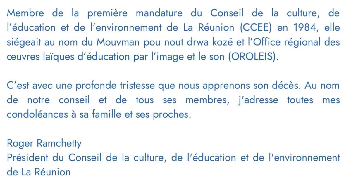 Le Conseil départemental s’honore de l’avoir comptée parmi les membres du Comité d’organisation du 150ème anniversaire de l’abolition de l’esclavage en 1998 et de sa présidence du jury du Prix littéraire de l’océan Indien qu’elle a assurée pendant plusieurs années, avec une autorité et une générosité unanimement appréciées. En mon nom personnel et en celui des Conseillers départementaux, j’adresse mes condoléances les plus sincères à toute sa famille».