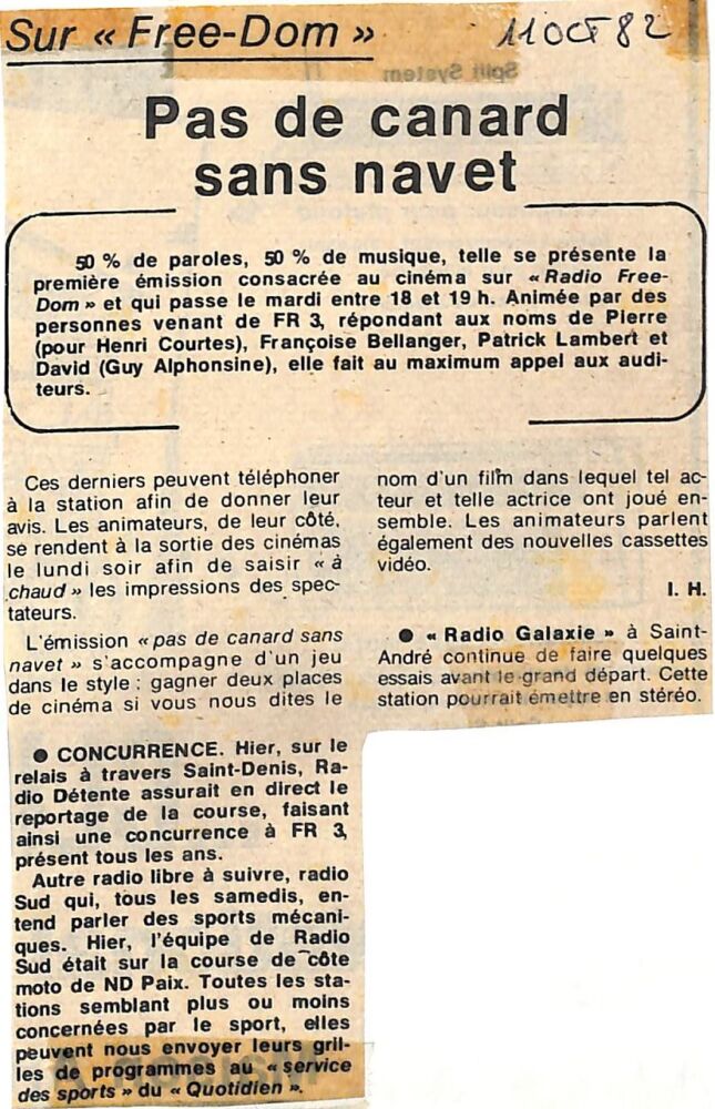 1982 L’émission « pas de canard sans navet » par La Rédaction 11 octobre 1982 1 min de lecture Ne manquez pas toute l’actualité de La Réunion ! Abonnez-vous à la newsletter de Free Dom ! Valider Partager Facebook Twitter Pinterest Linkedin Whatsapp Reddit Email Vous pourriez être intéressé par 10 décembre 1982 Un canular par jour sur Radio Free Dom 7 octobre 1982 L’émission « bleu outre-mer ou la radio de la méduse… » 18 septembre 1982 Exit la revue de presse de Radio Free Dom : pression de la droite au complot des socialistes et des communistes ? La Rédaction Laisser un commentaire Annuler la réponseYour email address will not be published. Enregistrer mon nom, mon e-mail et mon site dans le navigateur pour mon prochain commentaire. Current ye@r * Leave this field empty Article précédent L’émission « bleu outre-mer ou la radio de la méduse… » Article suivant Un canular par jour sur Radio Free Dom Articles récents... Hommage à Johnny Hallyday sur Free Dom 2 ce 5 décembre Mardi 30 décembre 2025 – Météo, éphéméride et horoscope du jour Saint-Joseph : découverte de 2337 plants de cannabis, arrestation de 2 individus Point sur le réseau routier départemental, 29 décembre à 16H30 Suicide sur le pont de la Rivière d’Abord : importante mobilisation des secours et des forces de l’ordre Radier submergé à Ilet Furcy : la route de Cilaos fermée à la circulation cette nuit Fortes pluies : appel à la plus grande prudence à Saint-Paul Saint-Gilles-les-Bains : une route impraticable, les riverains montent au créneau (VIDEOS) Très grands excès de vitesse : un délit passible de prison depuis le 29 décembre 2025 Fermeture temporaire du sentier de la Canalisation des Orangers (cirque de Mafate)
