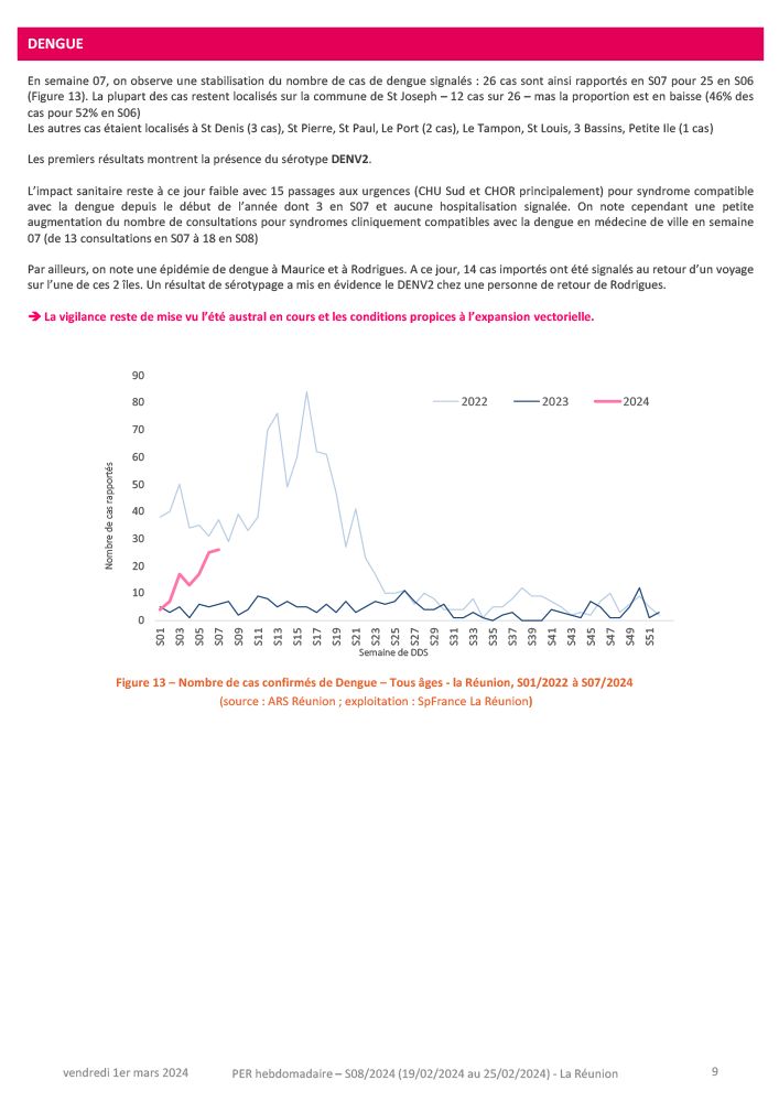 - · Dengue : Une stabilisation du nombre de cas signalés a été observée en semaine 07. La circulation reste localisée au sud de l’île.