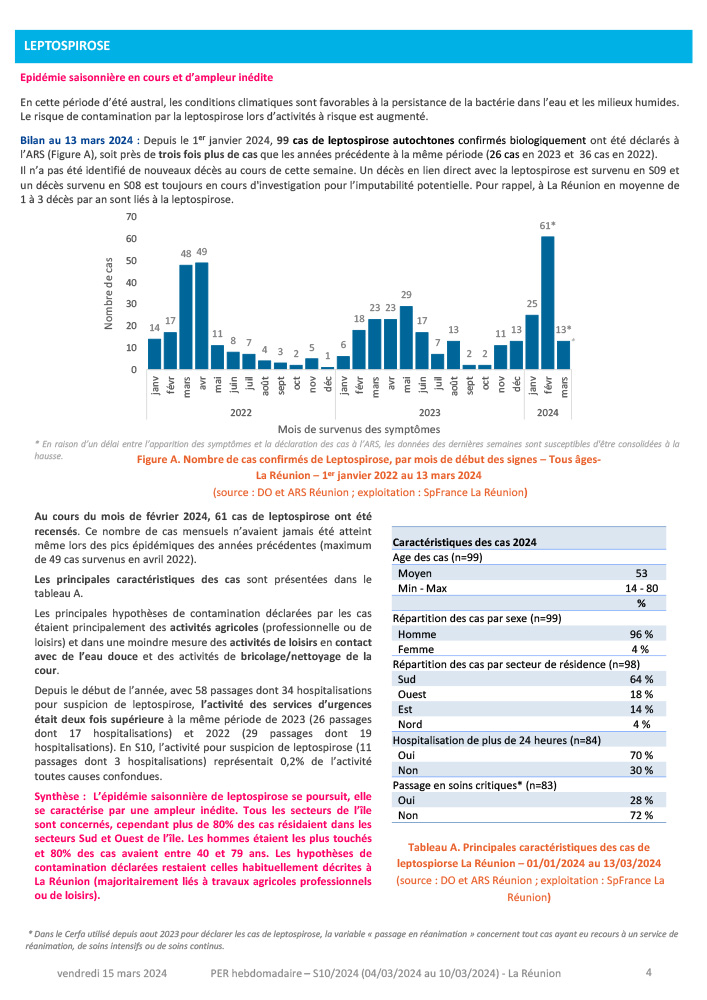 ·         Leptospirose : Epidémie saisonnière en cours à un niveau très élevé. Un mois de février record en terme de nombre de cas recensés.
