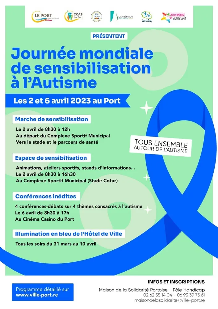 Actualités/Collectivités/Le Port Journée mondiale de sensibilisation à l’Autisme ce 6 avril au Port par Céline Hardelain 6 avril 2023 1 min de lecture Après une journée concluante le 2 avril, la mairie du Port refera une autre journée de sensibilisation à l’autisme le 6 avril avec 4 conférences débats au cinéma Casino de 8h30 à 17h. Ne manquez pas toute l’actualité de La Réunion ! Abonnez-vous à la newsletter de Free Dom ! Valider Partager Facebook Twitter Pinterest Linkedin Whatsapp Reddit Email Vous pourriez être intéressé par 1 janvier 2026 Jeudi 1ᵉʳ janvier 2026 – Météo, éphéméride et horoscope du jour 31 décembre 2025 Mercredi 31 décembre 2025 – Météo, éphéméride et horoscope du jour 30 décembre 2025 Mardi 30 décembre 2025 – Météo, éphéméride et horoscope du jour Céline Hardelain Laisser un commentaire Annuler la réponseYour email address will not be published. Enregistrer mon nom, mon e-mail et mon site dans le navigateur pour mon prochain commentaire. Current ye@r * Leave this field empty Article précédent Grève illimitée à Derichebourg : « le mouvement est motivé par des problèmes sociaux internes » Article suivant Communiqué des conseillers communautaires de la majorité municipale de Saint-Joseph CASUD: NON à l’augmentation intercommunale des taxes ! Articles récents... Jeudi 1ᵉʳ janvier 2026 – Météo, éphéméride et horoscope du jour Mercredi 31 décembre 2025 – Météo, éphéméride et horoscope du jour Hommage à Johnny Hallyday sur Free Dom 2 ce 5 décembre Mardi 30 décembre 2025 – Météo, éphéméride et horoscope du jour Saint-Joseph : découverte de 2337 plants de cannabis, arrestation de 2 individus Point sur le réseau routier départemental, 29 décembre à 16H30 Suicide sur le pont de la Rivière d’Abord : importante mobilisation des secours et des forces de l’ordre Radier submergé à Ilet Furcy : la route de Cilaos fermée à la circulation cette nuit Fortes pluies : appel à la plus grande prudence à Saint-Paul Saint-Gilles-les-Bains : une route impraticable, les riverains montent au créneau (VIDEOS)
