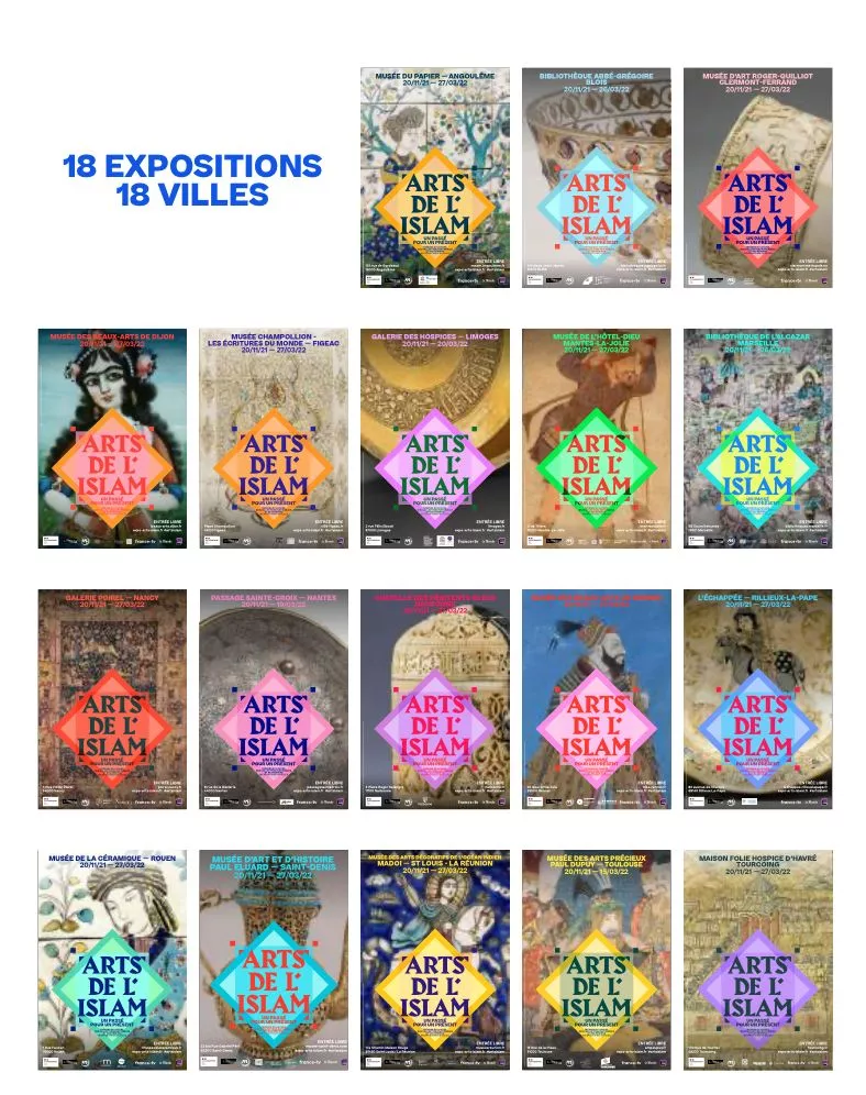 Pour chaque accrochage, 10 œuvres, à la fois historiques et contemporaines, issues du département des Arts de l’Islam du musée du Louvre et de collections nationales et régionales, incarneront la richesse des cultures de l’Islam et leur inscription dans l’histoire de France depuis plus de 1 300 ans. Plus de 180 œuvres au total seront ainsi présentées au public : une lampe de mosquée du XIe siècle provenant de Jérusalem (musée du Louvre), un chandelier de l’époque de Saladin signé par un artiste de Mossoul racontant la vie de Jésus (musée du Louvre), des boîtes de toilettes en ivoire du XIIIe siècle ayant appartenu aux duchesses de Bourgogne, provenant de l’abbaye de Cîteaux et aujourd’hui au musée des Beaux-Arts de Dijon, une œuvre de l’artiste Hiwa K, One Room Apartment (FRAC Normandie) ou bien Les Collages de Topak Ev de l’artiste française d’origine turque Nil Yalter.