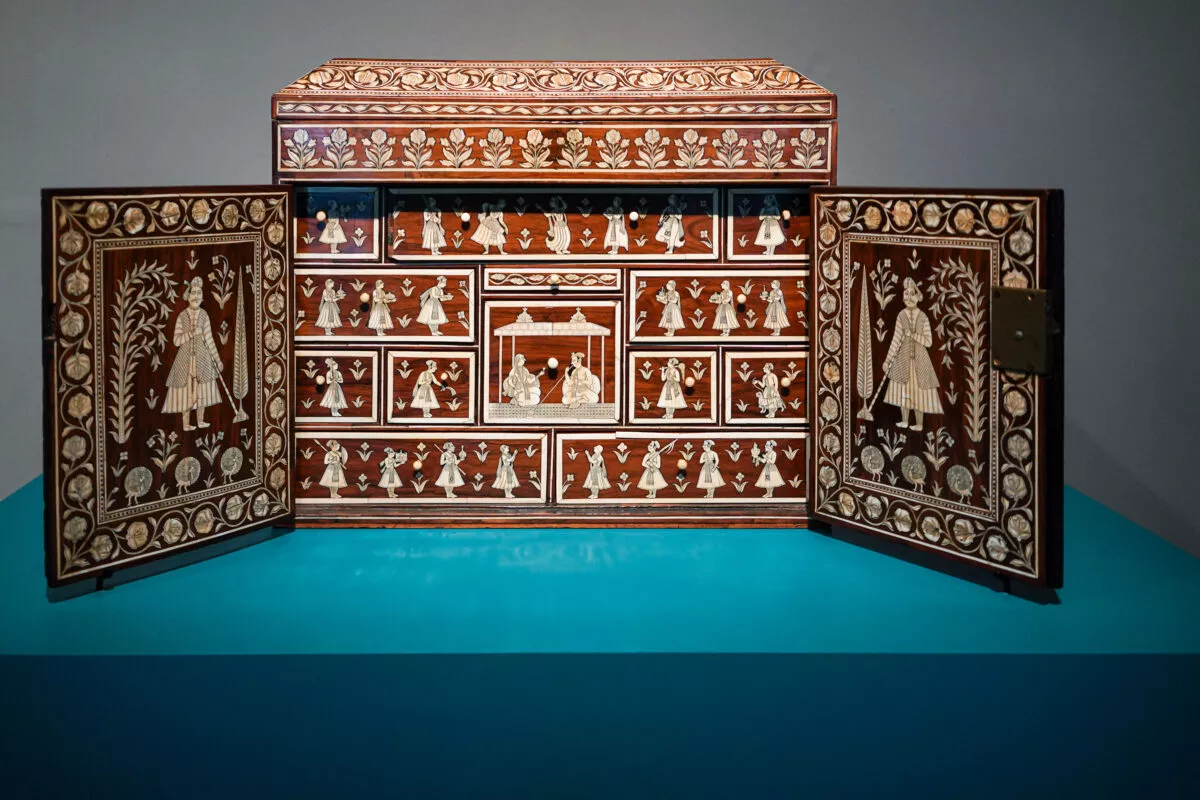 Dans l’exposition, un jali en grès rose est particulièrement valorisé. Il vous plonge dans l’architecture moghole du temps des empereurs Akbar ou Jahangir avec ses propres caractéristiques indiennes mais en s’inspirant de l’architecture islamique du moucharabieh. Le cabinet indien du XVIIe siècle nous permet de comprendre cet art parfois appelé « indo- portugais ». Il reprend en effet le principe de ce type de mobilier très en vogue en Europe dès la fin du Moyen-Âge. Les modèles indiens à l’époque du rayonnement de l’empire moghol en Inde étaient destinés notamment aux Européens présents sur le continent, dans les colonies portugaises à cette époque. Les bois précieux et la nacre en constituent les matériaux nobles qui attiraient déjà les clientèles iraniennes, arabes et turques au temps des routes terrestres de ’Asie à la Méditerranée. Les modèles décoratifs végétaux ou humains s’inspirent des scènes présentes dans la peinture miniature de cette époque.