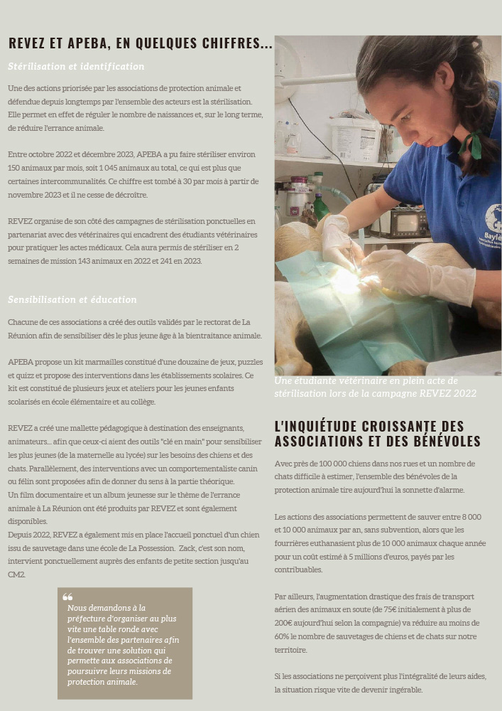Les conséquences sont désolantes puisque, concernant REVEZ, c’est près de 10 000€ qui ne peuvent être remboursés aux vétérinaires qui ont participé bénévolement à la mission de stérilisation avec des étudiants vétérinaires en août 2023. Cette somme correspond notamment à la location des taxis animaliers et aux frais médicaux (matériel chirurgical, produits anesthésiants…). Ce qui remet en cause l’engagement des professionnels pour le renouvellement d’une telle mission en 2024.