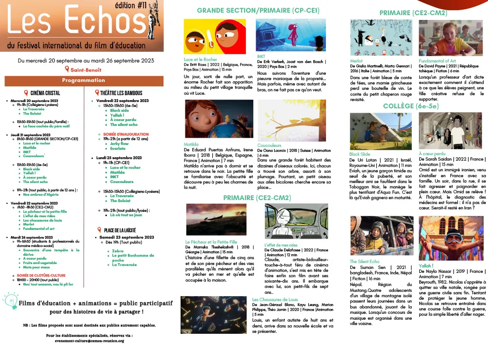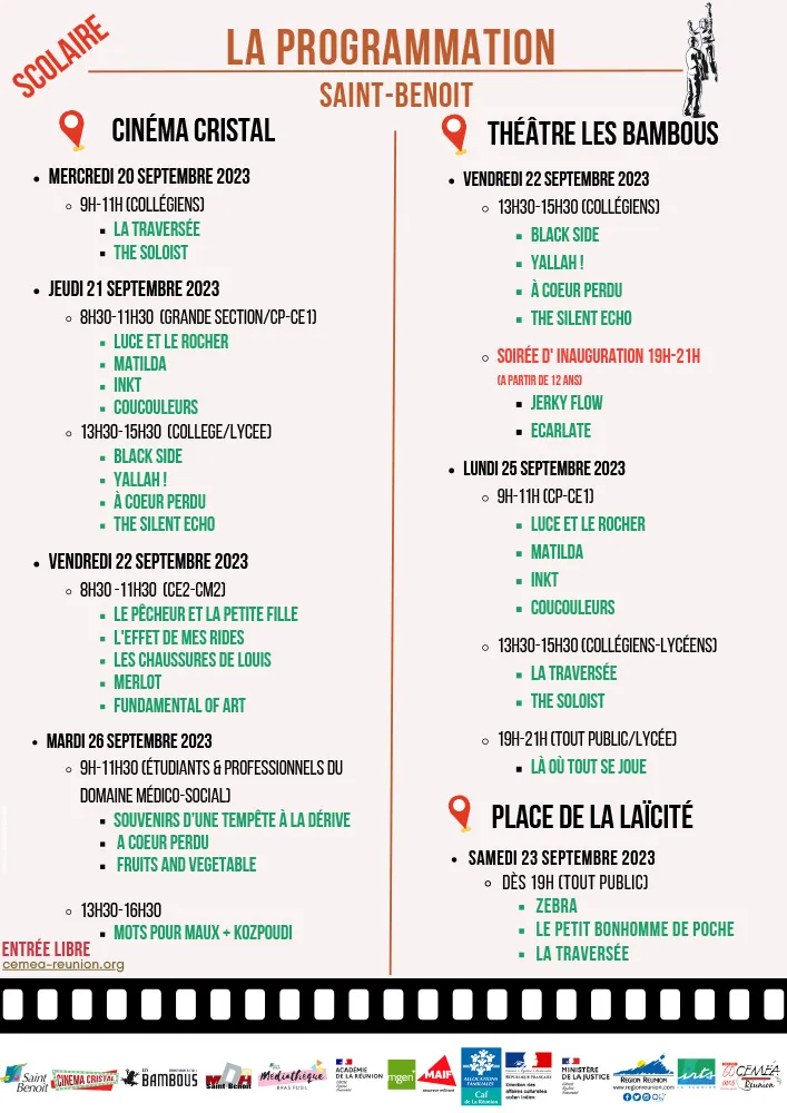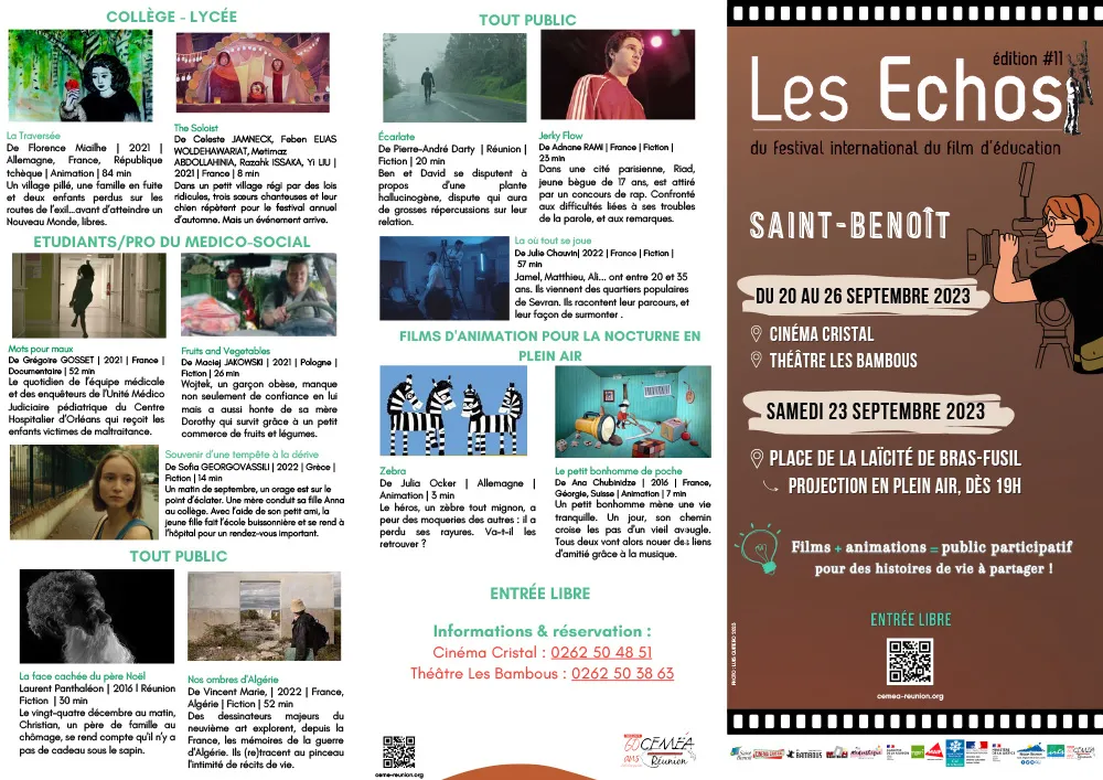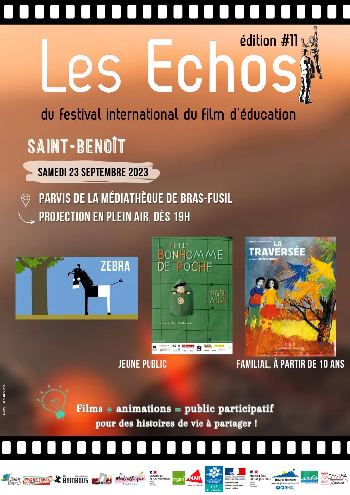 Les CEMÉA Réunion et la Ville de Saint-Benoît, vous proposent les Échos du Festival International du Film d’Éducation (FIFE) du 20 au 26 septembre 2023 sur 3 lieux de diffusion inédits :