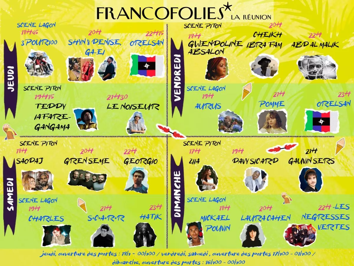 La programmation musicale des Francos génère déjà de l’attractivité ! Les artistes à l’affiche permettent de proposer une manifestation ambitieuse, riche et diversifiée à Saint-Paul. Des têtes d’affiche locales comme Grèn Semé, Davy SICARD, Mickaël POUVIN, AURUS, et nationales comme Orelsan, Laura CAHEN, POMME, ABD AL MALIK, le Noiseur et GEORGIO. Une programmation résolument orientée vers la jeunesse!