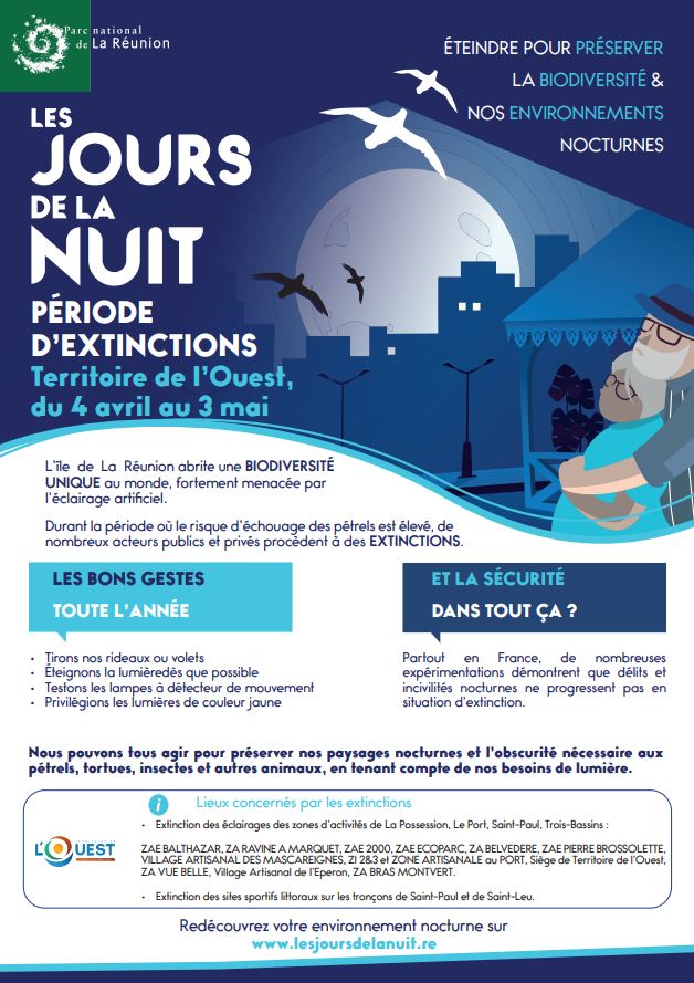 L’édition 2024 des « Jours de la Nuit » a lieu du jeudi 4 avril au vendredi 3 mai. L’objectif de cette action est de préserver la biodiversité de notre île en éteignant les éclairages qui perturbent l’envol des pétrels et la reproduction des tortues, notamment.