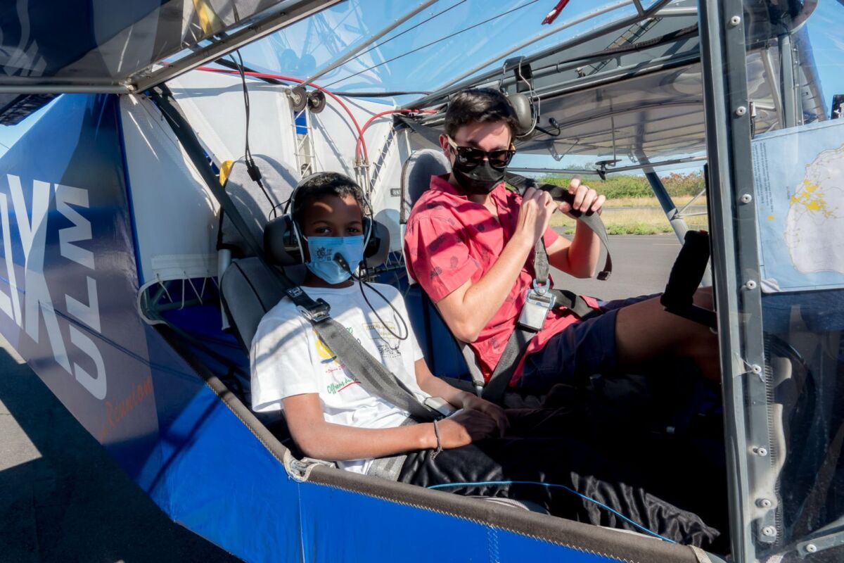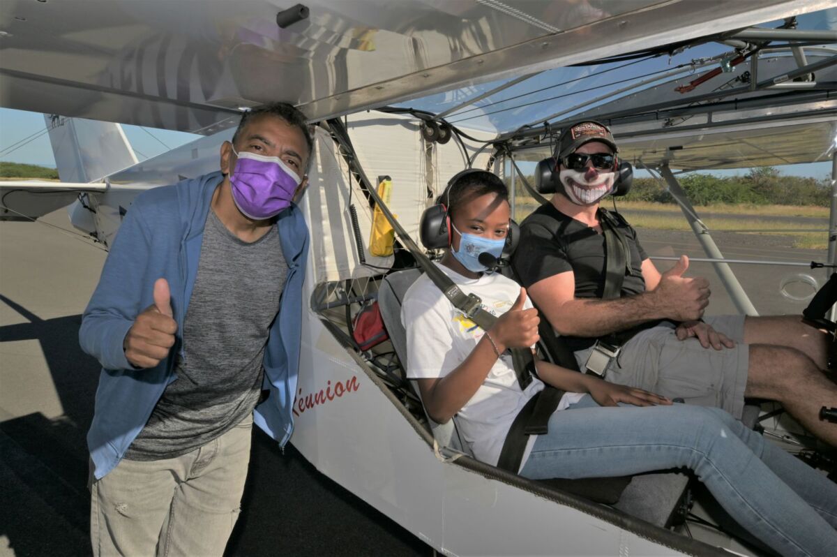 Et pour l’opération du jour, l’association accueille non pas un, mais deux invités surprises : l’humoriste Thierry Jardinot, parrain historique de 1000 Sourires et l’artiste Missty, qui participe à une opération pour la première fois. Les deux parrains ont été plus que ravis de passer cette journée avec les marmailles, qui, aux côtés de l’équipe de Félix ULM, ont pu survoler le ciel de Saint-Paul pendant de longs moments. Une sortie magique pour ces Very Important Marmailles (VIM) qui n’avaient jamais vu leur commune sous cet angle !