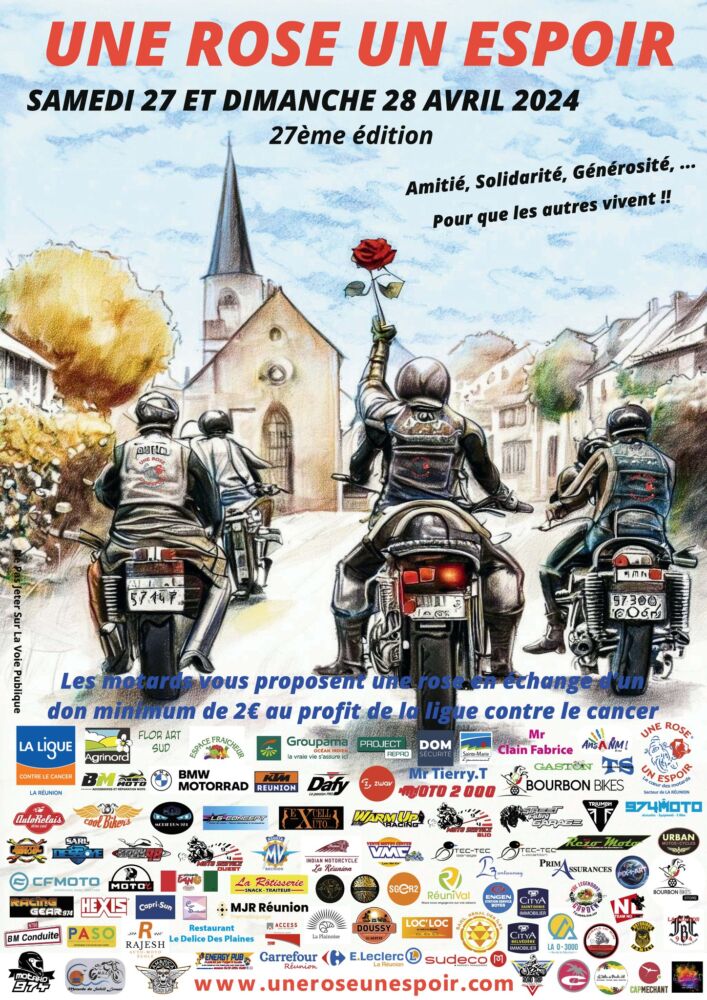 Les motards et bénévoles de l’association Une Rose, un Espoir, secteur de La Réunion, seront présents les 27 et 28 avril 2024 dans et devant vos centres commerciaux et des commerces partenaires à travers toute l’île.