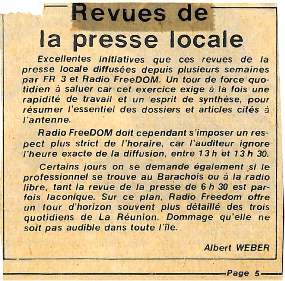 1981 Les premières revues de presse de Radio Free Dom par La Rédaction 30 octobre 1981 1 min de lecture Les premières revues de presse de Radio Free Dom ont commencé deux mois après sa naissance. Ne manquez pas toute l’actualité de La Réunion ! Abonnez-vous à la newsletter de Free Dom ! Valider Partager Facebook Twitter Pinterest Linkedin Whatsapp Reddit Email Vous pourriez être intéressé par 14 janvier 2023 69 migrants sri lankais sont arrivés au Port à 4h30 23 décembre 1981 Lettre ouverte à un commentateur de Radio Free Dom 1 décembre 1981 Radios libres : Noël Caro s’indigne La Rédaction Laisser un commentaire Annuler la réponseYour email address will not be published. Enregistrer mon nom, mon e-mail et mon site dans le navigateur pour mon prochain commentaire. Current ye@r * Leave this field empty Article précédent Reportage sur Radio Détente Article suivant L’une des premières soirées dansantes de Radio Free Dom Articles récents... Hommage à Johnny Hallyday sur Free Dom 2 ce 5 décembre Mardi 30 décembre 2025 – Météo, éphéméride et horoscope du jour Saint-Joseph : découverte de 2337 plants de cannabis, arrestation de 2 individus Point sur le réseau routier départemental, 29 décembre à 16H30 Suicide sur le pont de la Rivière d’Abord : importante mobilisation des secours et des forces de l’ordre Radier submergé à Ilet Furcy : la route de Cilaos fermée à la circulation cette nuit Fortes pluies : appel à la plus grande prudence à Saint-Paul Saint-Gilles-les-Bains : une route impraticable, les riverains montent au créneau (VIDEOS) Très grands excès de vitesse : un délit passible de prison depuis le 29 décembre 2025 Fermeture temporaire du sentier de la Canalisation des Orangers (cirque de Mafate)