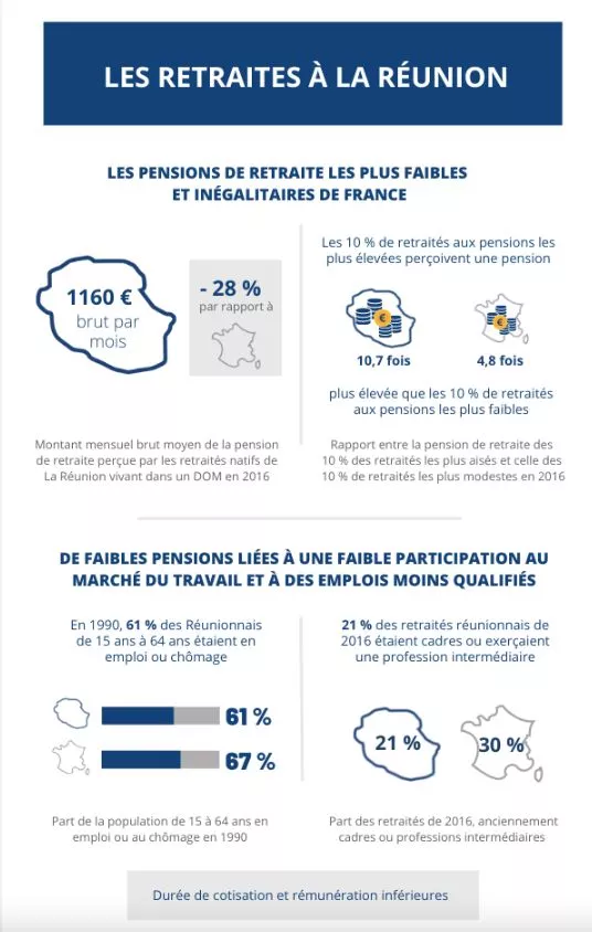 Les natifs de La Réunion vivant dans un département d’Outre-mer perçoivent les pensions de retraite les plus faibles des régions françaises : 1 160 euros brut par mois en moyenne en 2016, soit 28 % de moins que dans l’Hexagone. Les inégalités en matière de pension de retraite sont en outre plus importantes sur l’île. Ces faibles pensions résultent d’une participation plus faible qu’ailleurs des personnes en âge de travailler au marché du travail, qui se traduit par une durée moyenne de cotisation nettement plus basse. De plus, les emplois occupés sont moins qualifiés. Les seniors réunionnais sont ainsi nombreux à avoir dû travailler jusqu’à l’âge de départ requis pour bénéficier automatiquement d’une retraite à taux plein. Toutefois, les pensions moyennes de retraite augmentent fortement sur la période 2012 à 2016, avec l’arrivée à l’âge de la retraite de personnes ayant davantage travaillé que les générations précédentes. Les Réunionnaises perçoivent une retraite plus faible que leurs homologues masculins en raison, pour l’essentiel, d’une moindre participation au marché du travail.