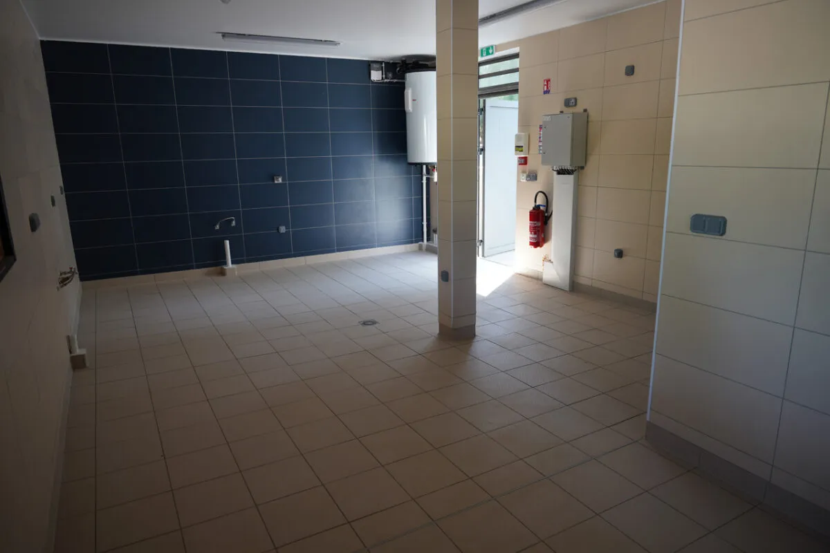 L’accès aux snacks se fait par des marches situées face à chaque comptoir d’accueil, ainsi que par des rampes latérales garantissant l’accessibilité pour les personnes à mobilité réduite. Les cuisines, tout comme les terrasses, sont couvertes par une toiture en charpente bois, favorisant une ventilation naturelle tout en protégeant contre le soleil et la pluie. Côté public, le bâtiment est habillé d’un bardage en bois de couleur bleu, évoquant les cabanons de plage.