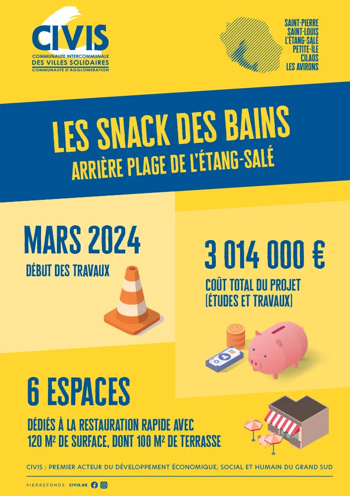 Dans un souci de développement économique et touristique, la CIVIS en concertation avec la commune de L’Étang-Salé a fait le choix de revoir et d’améliorer l’attractivité et le cadre de vie de la zone de L’Étang-Salé les bains.