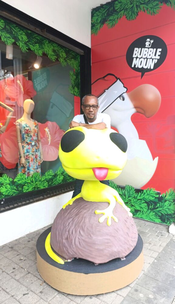Max s’est rendu à Saint-Pierre et a immortalisé un moment devant un Bobble Moun géant. Ils sont six en tout installés, fièrement devant chaque boutique Pardon de l’île. Et petit détail amusant : la tête du margouillat bouge, comme pour saluer les passants !