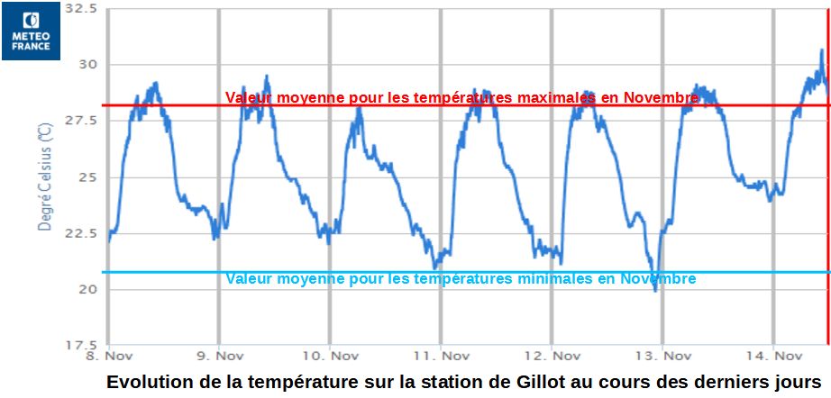A noter que c’est la première fois, en ce début de saison chaude, que les 30°C sont atteints (et dépassés) à Gillot et Pierrefonds. Ce temps chaud et sec reste d’actualité en ce début de semaine.