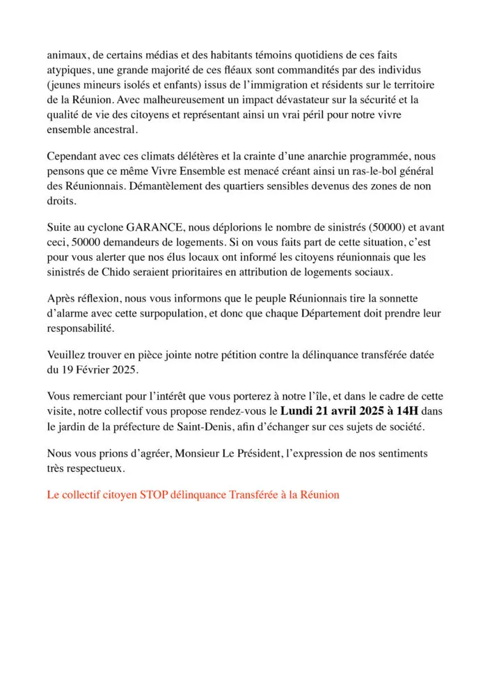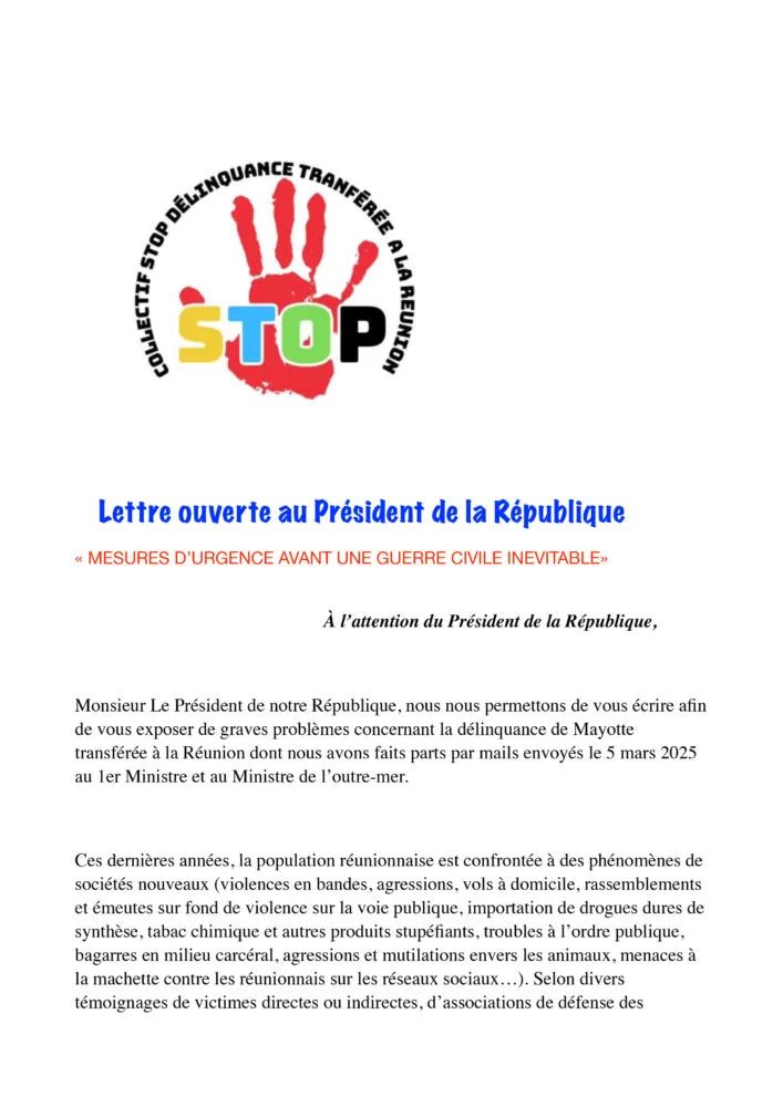 Dans un contexte de tensions croissantes et d’inquiétudes grandissantes au sein de la population réunionnaise, le collectif citoyen STOP Délinquance Transférée à la Réunion adresse une lettre ouverte au Président de la République. Intitulée « Mesures d’urgence avant une guerre civile inévitable », cette missive alerte sur « les conséquences de la délinquance importée » et appelle les autorités à « prendre des mesures immédiates pour préserver la sécurité et la cohésion sociale sur l’île ».