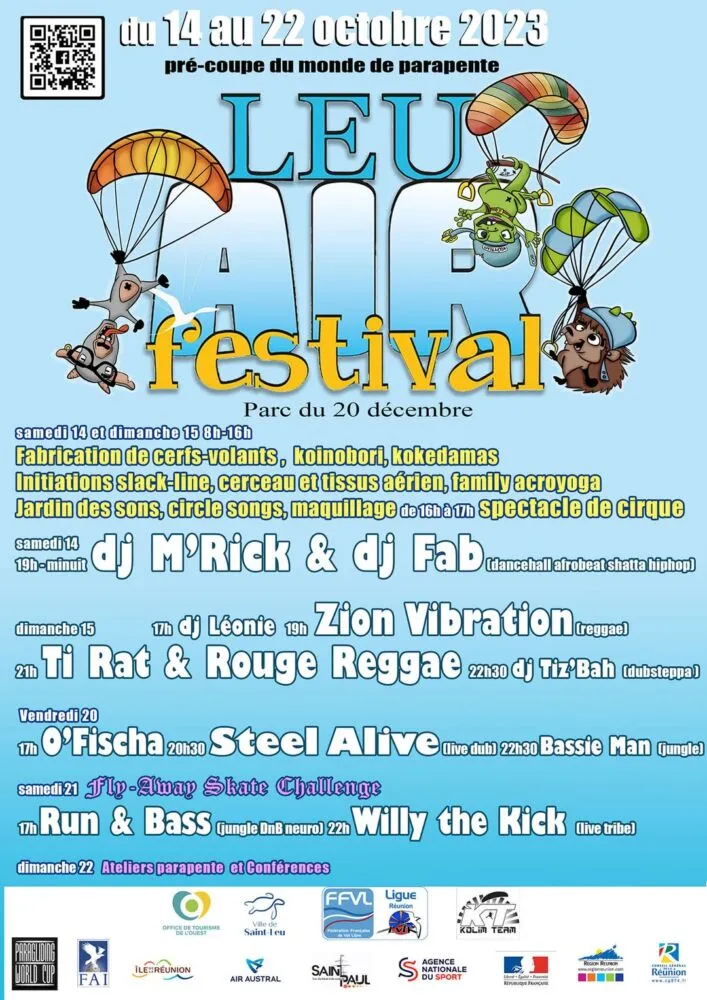 Du 14 au 22 octobre 2023 se déroulera à la Réunion la Pré-World Cup de parapente, organisée par la Ligue de Vol Libre de La Réunion, avec de nombreuses animations (ateliers, concerts …), mises en place les week-ends au Parc du 20 décembre, avec le concours de l’Office de Tourisme de l’Ouest.