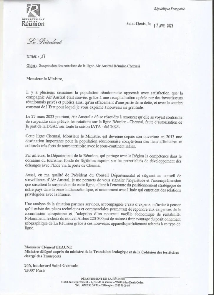 Depuis le 31 mars dernier, il n’existe plus de liaison aérienne directe entre notre île et l’Inde. Les vols étaient jusqu’à cette date assurés par la compagnie régionale Air Austral. Il s’agissait de vols directs hebdomadaires aller-retour Saint-Denis de la Réunion-Chennaï (Inde). Mais le 27 mars dernier, par un communiqué de presse, Air Austral annonçait l’arrêt des opérations entre notre île et l’Inde. Une suspension de la liaison pour la période allant du 27 mars au 29 octobre 2023 car, comme l’a expliqué la compagnie régionale, elle n’a pas reçu les autorisations nécessaires de la part des autorités compétentes. A savoir la commission européenne qui considère la ligne comme « non rentable ».