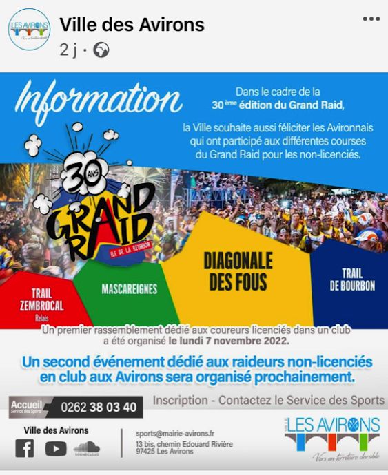 On reste dans une petite commune limitrophe et dans le domaine du sport, pour vous parler des Avirons où le maire Eric Ferrère a organisé, lundi dernier, en fin d’après-midi, une « cérémonie de réception » (c’est écrit comme ça sur le Facebook de la ville) pour « les valeureux raideurs des différentes courses du Grand Raid 2022 ». Parmi les invités, on retrouvait également des sportifs avironnais qui avaient arpenté durant 17 jours les sentiers menant au camp de base de l’Everest à 5 364 mètres d’altitude. Jusqu’ici, rien à dire. Et c’est tout à la gloire du maire-écrivain de célébrer les sportifs de sa commune. Sauf que les autres raideurs non licenciés qui n’ont pas été conviés à la fête l’ont un peu mal pris. Raison pour laquelle, la municipalité a décidé d’organiser également « une cérémonie de réception » pour ces derniers. Je vous laisse découvrir le carton d’invitation qui a été publié sur la page Facebook de la ville des Avirons précisant que « la Ville souhaite aussi féliciter… ».