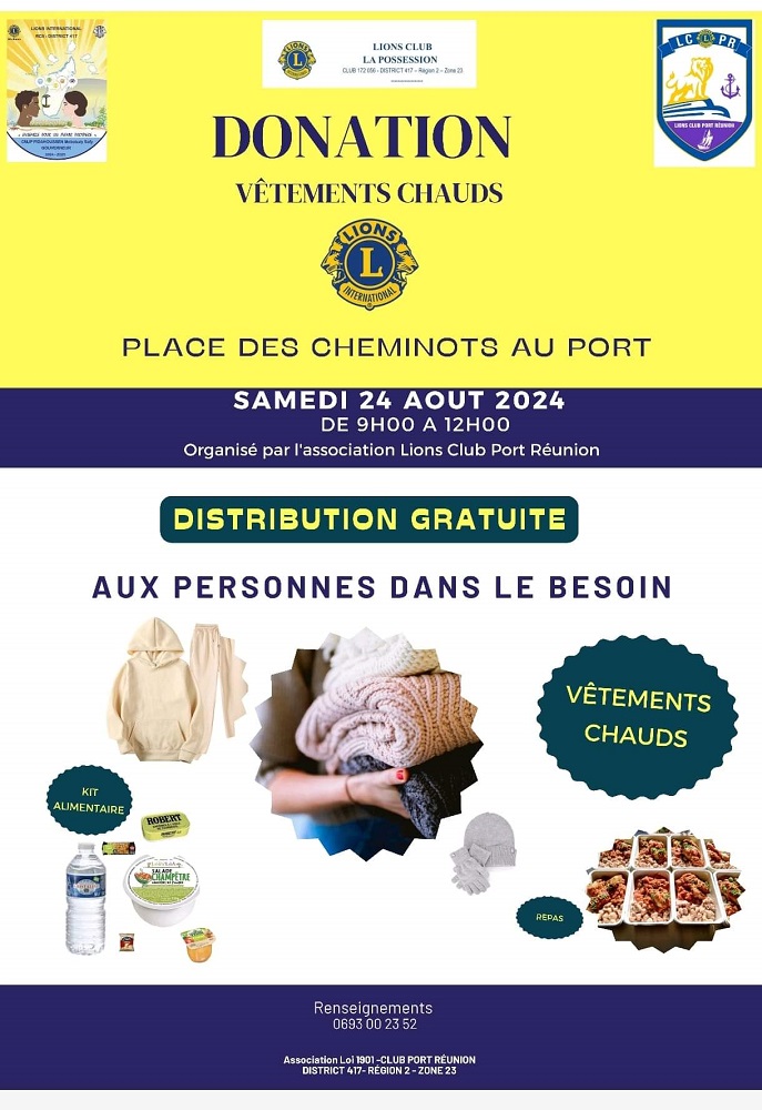 Le Lions Club Port Réunion organise une action solidaire ce samedi 24 août à la Place des Cheminots, au Port dès 9h. L’association viendra en aide aux sans-abris et aux personnes en situation de précarité en distribuant des kits repas, des vêtements chauds, ainsi que des repas chauds.