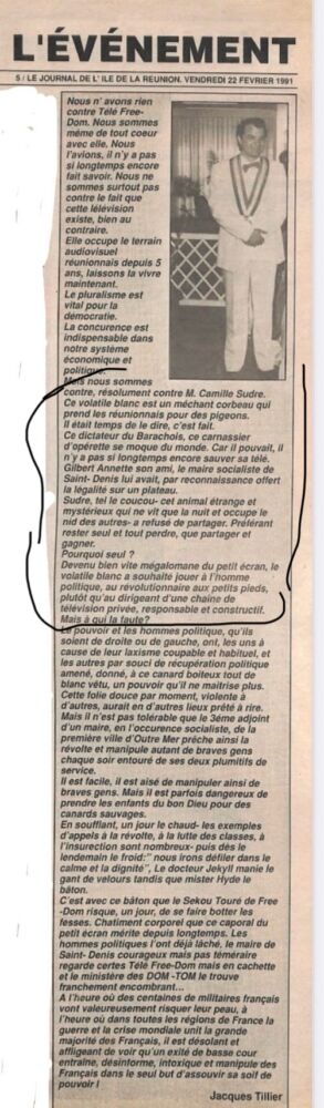 Ce que pensait Jacques Tillier de de Camille Sudre à l’époque de Télé Free Dom : « Nous sommes résolument contre Monsieur Camille Sudre. Ce volatile blanc est un méchant corbeau qui prend les réunionnais pour des pigeons… Ce dictateur du Barachois, ce carnassier d’opérette… » (documents le JIR 22 février 1991–Archives Free Dom)