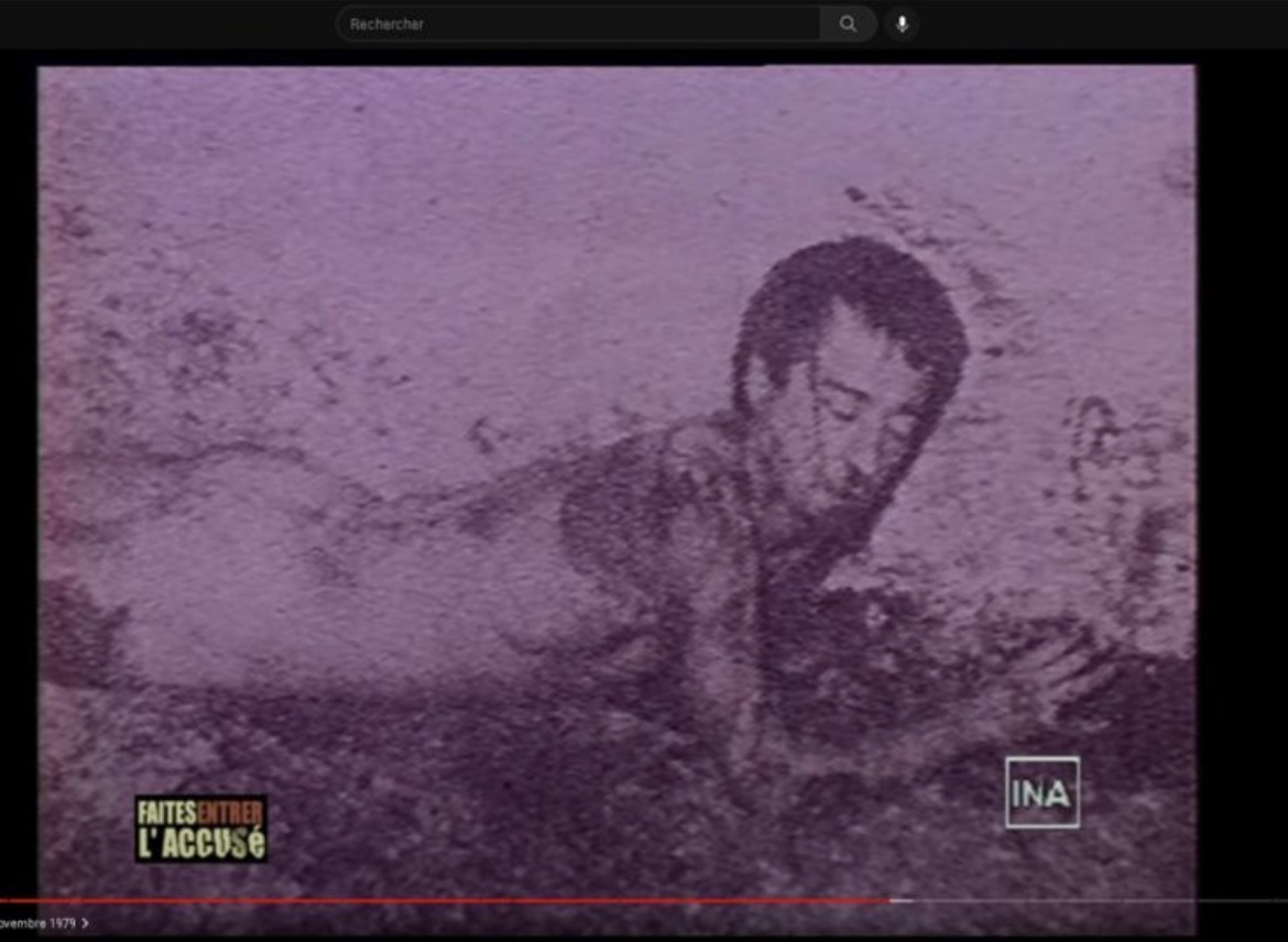 Jacques Tillier nu, attaché et percé de trois balles par Jacques Mesrine en Septembre 1979 (Photo extraite de l’émission « Faites entrer l’accusé”  consacré à Francois Besse