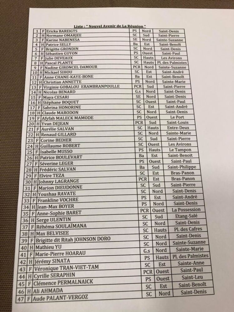 1. Ericka Bareigts, 2. Normane Omarjee , 3. Karine Nabenesa , 4. Patrice Selly , 5. Brigitte Grondin , 6. Sebastien Guyon , 7. Julie Deveaux , 8. Pascal Plante , 9. Nadine Gironcel Damour , 10. Mickael Sihou , 11. Anne Chane Kaye Bone , 12. Christian Annette , 13. Virginie Gobalou , 14. Nicolas Benard , 15. Maya Césari , 16. Stéphane Boquet , 17. Sabrina Honorine, 18. Claude Marodon , 19. Afyfah Maleck Mamode , 20. Yvan Dejean , 21. Aurelie Salvan , 22. Renaud Gillard , 23. Corine Bedier , 24. Guillaume Robert , 25. Isabelle Musso , 26. Patrice Boulevart , 27. Séverine Léger , 28. Frédéric Salvan , 29. Elvire Teza , 30. Johnny Lagrange , 31. Marion Dieudonné, 32. Youshaa Ravate, 33. Frankline Vochre , 34. Jean Max Boyer , 35. Anne Sophie Baret, 36. Serge Ulentin , 37. Rehema Soulaimana , 38. Max Belvisée, 39. Brigitte dit Ritah Johnson Doro, 40. Mathieu Yu , 41. Marie-Pierre Hoarau , 42. Jeremy Sinata , 43. Veronique Tran-Viet-Tam , 44. Cyrille Séraphin , 45. Clémence Permalnaick, 46. Ali Ahmada , 47. Aude Palant-Vergoz.