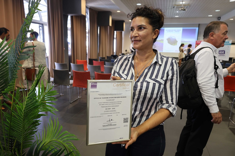 Ce mardi 16 avril, à l’Hôtel Exsel Créolia, s’est déroulée une rencontre d’importance majeure pour l’Office de Tourisme Intercommunal du Nord (OTI Nord) de La Réunion. Après une journée entière consacrée aux ateliers sur les notions de Responsabilité Sociétale des Entreprises (RSE) et de développement durable, l’OTI Nord a eu l’honneur de se voir remettre officiellement le prestigieux certificat ISO 9001 par l’Association Française de Normalisation (AFNOR).