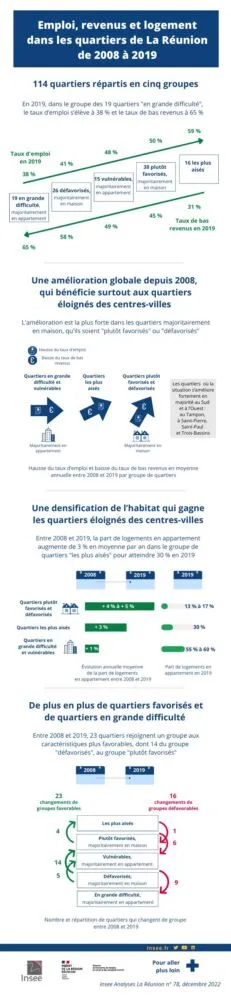 Au cours de la décennie qui suit la crise économique et financière de 2008, la situation socio-économique de La Réunion progresse selon une nouvelle étude publiée par l’INSEE. Cette amélioration est la plus marquée dans les quartiers où l’habitat est moins dense qu’ailleurs, en majorité à l’ouest et au sud de l’île. Le niveau de vie des habitants y augmente en effet fortement car ils sont de plus en plus nombreux en emploi, notamment sur des postes de cadre ou de profession intermédiaire. Parallèlement, l’habitat se densifie dans ces quartiers, avec la construction de nombreux immeubles, de logements sociaux en particulier.