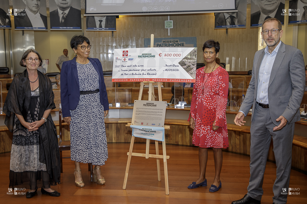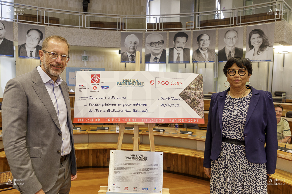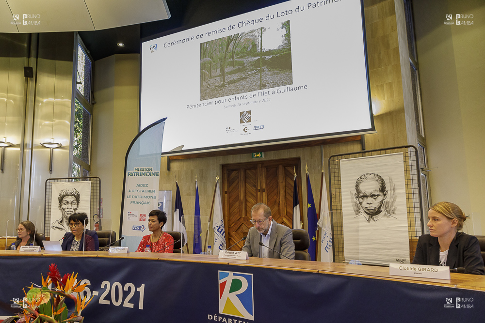 Écrin de verdure chargé d’histoire, le pénitencier pour enfants de l’Ilet à Guillaume a été sélectionné parmi les 18 sites emblématiques de France et d’Outre Mer, retenus par la Mission Patrimoine en 2021. La cérémonie de remise de la dotation d’un montant de 200 000€ s’est tenue dans l’Hémicycle du Palais de la Source ce samedi 18 septembre 2021. Le chèque a été remis au Département de La Réunion, porteur du « projet de connaissance, de préservation et de valorisation du site », lors d’une cérémonie organisée avec la Fondation du Patrimoine/Mission Bern représentée par Monique Ozoux sa déléguée Réunion et la Française des Jeux, représentée par Frédéric Vezy, responsable des agences de la FDJ, entouré de quelques buralistes; ainsi que de Guilène Tacoun de la Direction des Affaires Culturelles (DAC Réunion) et de tous les acteurs du projet. Sans oublier des habitants du quartier de Saint-Bernard et le groupe Rezonans Kreol qui ont mis en avant un autre patrimoine de La Réunion : le Maloya, entonné « dans le rond » de l’Hémicycle du Palais de la Source.