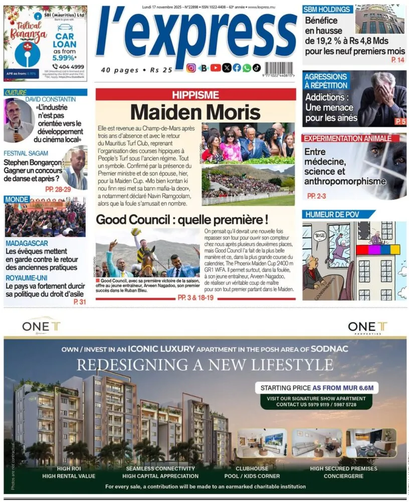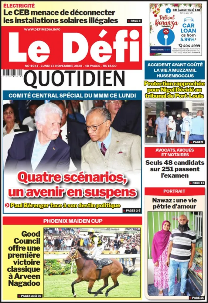 La presse mauricienne est dominée par les enjeux politiques. Le Défi Quotidien se concentre sur les quatre scénarios qui pourraient déterminer l’avenir du MMM, alors que Paul Bérenger se retrouve face à des choix jugés décisifs pour la suite de sa carrière politique. Le journal revient aussi sur la Phoenix Maiden Cup, marquée par la victoire de Good Council sous la monte d’Arveen Nagadoo. Du côté de L’Express de Maurice, c’est un retour très attendu au Champ-de-Mars : la course Maiden Moris retrouve sa place après trois ans d’absence, portée par une forte affluence. Les questions économiques restent également présentes, notamment sur les bénéfices du SBM Holdings et la montée des addictions, décrite comme une menace croissante pour les jeunes.