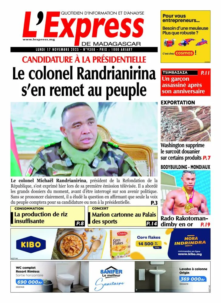 À Antananarivo, L’Express de Madagascar met en avant la prise de position politique du colonel Michaël Randrianirina. Le président de la Refondation de la République s’exprime pour la première fois à la télévision et renvoie sa décision de candidature présidentielle “au peuple”, sans confirmer officiellement son intention. Il évoque les grands dossiers du moment tout en contournant la question de sa participation au scrutin à venir. Le journal souligne également l’insuffisance persistante de la production de riz, ainsi qu’un débat croissant autour de l’exportation après la suppression de certains surcoûts douaniers par Washington.