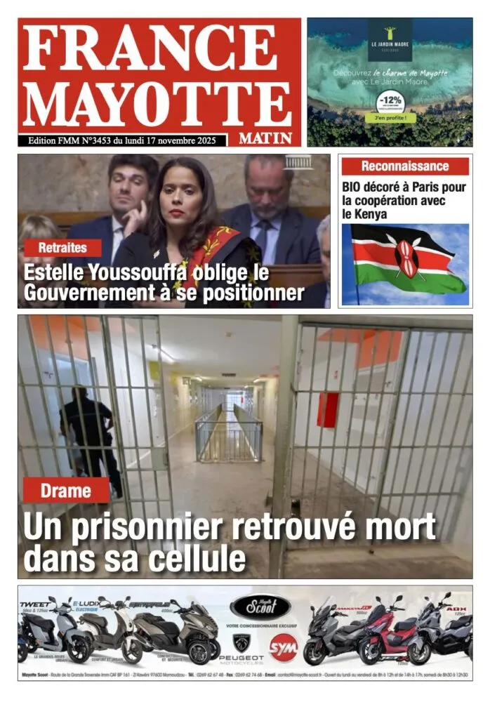 À Mamoudzou, France Mayotte Matin revient sur un dossier social sensible : la députée Estelle Youssouffa met la pression sur le gouvernement en matière de réforme des retraites, obligeant Paris à clarifier sa position. Le journal se fait aussi l’écho d’un drame survenu à la maison d’arrêt, où un détenu a été retrouvé mort dans sa cellule, relançant les inquiétudes sur les conditions carcérales. Par ailleurs, le préfet Thierry Suquet, dit BIO, reçoit une distinction à Paris pour son travail de coopération avec le Kenya.
