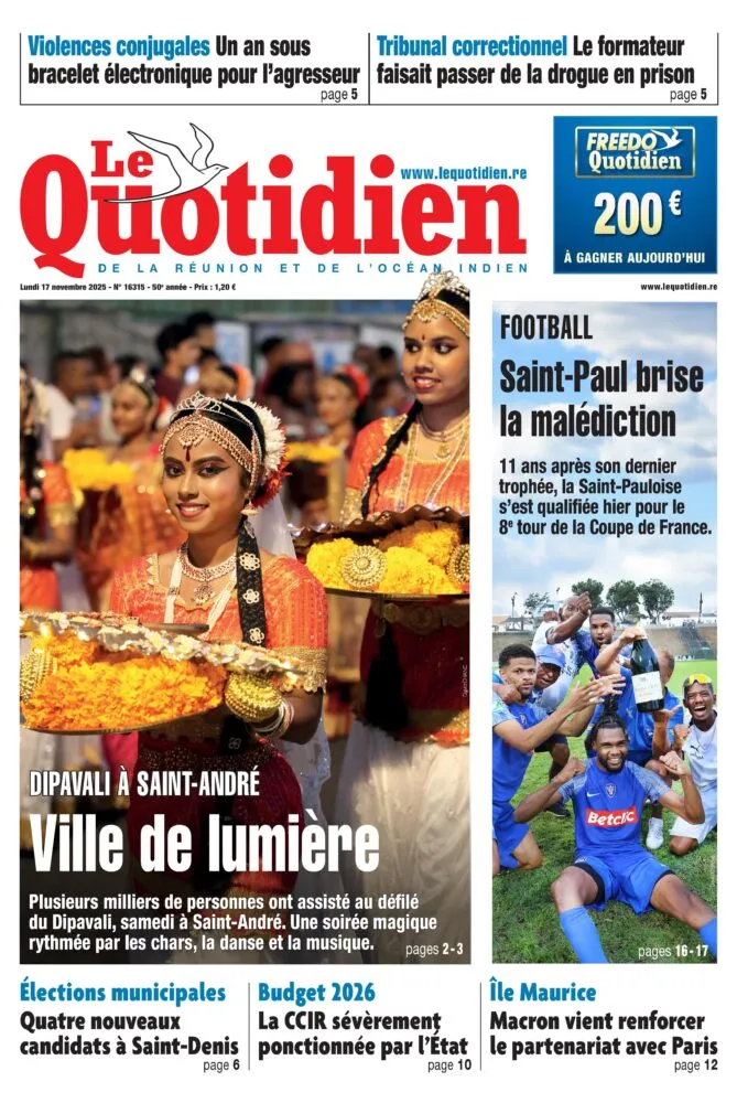 Le Quotidien de La Réunion titre sur un week-end placé sous le signe de la lumière : des milliers de personnes ont participé au défilé du Dipavali à Saint-André, célébration haute en couleurs mêlant danse, musique et processions. Sur le plan sportif, Saint-Paul brise enfin la malédiction et décroche sa qualification pour le 8e tour de la Coupe de France, onze ans après son dernier trophée. Le journal aborde aussi des questions politiques et économiques, notamment l’impact du budget 2026 sur la Chambre de commerce, ainsi que les quatre nouveaux candidats déclarés à Saint-Denis pour les municipales.
