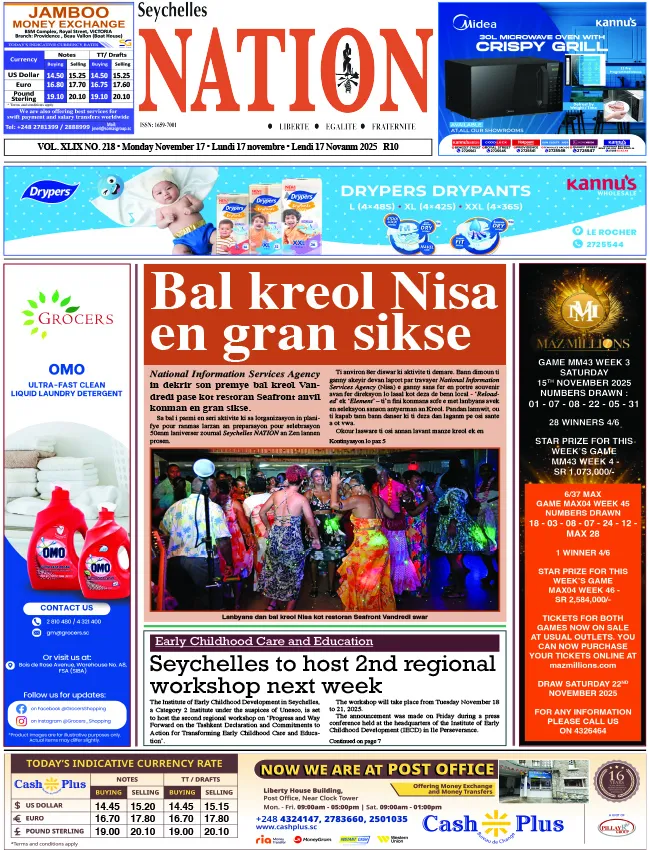 Aux Seychelles, Seychelles Nation titre sur le succès du Bal Kreol Nisa, organisé par l’agence d’information nationale. L’événement, très fréquenté, s’est déroulé au Seafront et a marqué la reprise des grands rendez-vous culturels de fin d’année. Le quotidien annonce aussi l’accueil prochain d’un atelier régional consacré à la petite enfance, prévu dès le 18 novembre, confirmant le rôle de l’archipel comme plateforme de coopération éducative dans la région.