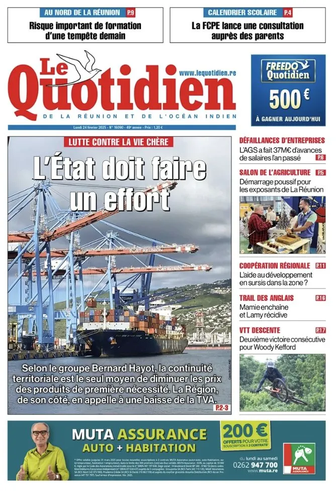 Voici un résumé des principaux titres de l’édition du Quotidien de La Réunion et de l’Océan Indien du lundi 24 février 2025 :